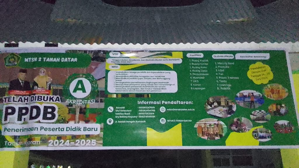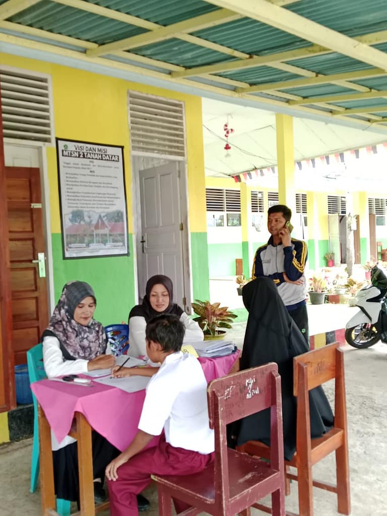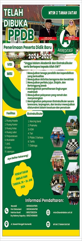 Sumanik (MTsN 2 Tanah Datar) tanggal 24 – 26 Juni 2024 telah dibuka pendaftaran Penerimaan Peserta Didik Baru (PPDB) Tahun Pelajaran 2024/2025. Seluruh tamatan SD/MI sudah bisa mendaftarkan diri ananda ke MTsN 2 Tanah Datar secara offline, yaitu langsung datang ke Madrasah dengan membawa seluruh persyaratan yang telah ditentukan oleh pihak Madrasah. Kegiatan penerimaan calon peserta didik baru berjalan dengan lancar dan tertib. Pelaksanaan PPDB MTsN 2 TD memberikan beberapa keunggulan yang bisa dijadikan pilihan dan kemantapan kepada masyarakat sekitar yang akan memilih dan masuk di MTsN 2 Tanah Datar sehingga siswa kelas VI tamatan dari Sekolah Datar atau Madrasah Ibtidaiyah (SD/MI) tidak perlu bingung mencari pendidikan lanjutan setelah lulus. Semoga MTsN 2 Tanah Datar memperoleh Input dari peserta didik baru yang lebih baik dan berkualitas sehingga belajar di lembaga pendidikan yang lebih berkualitas. Sesuai dengan logo madarasah, yaitu “Madrasah Hebat Bermutu dan Mendunia”.