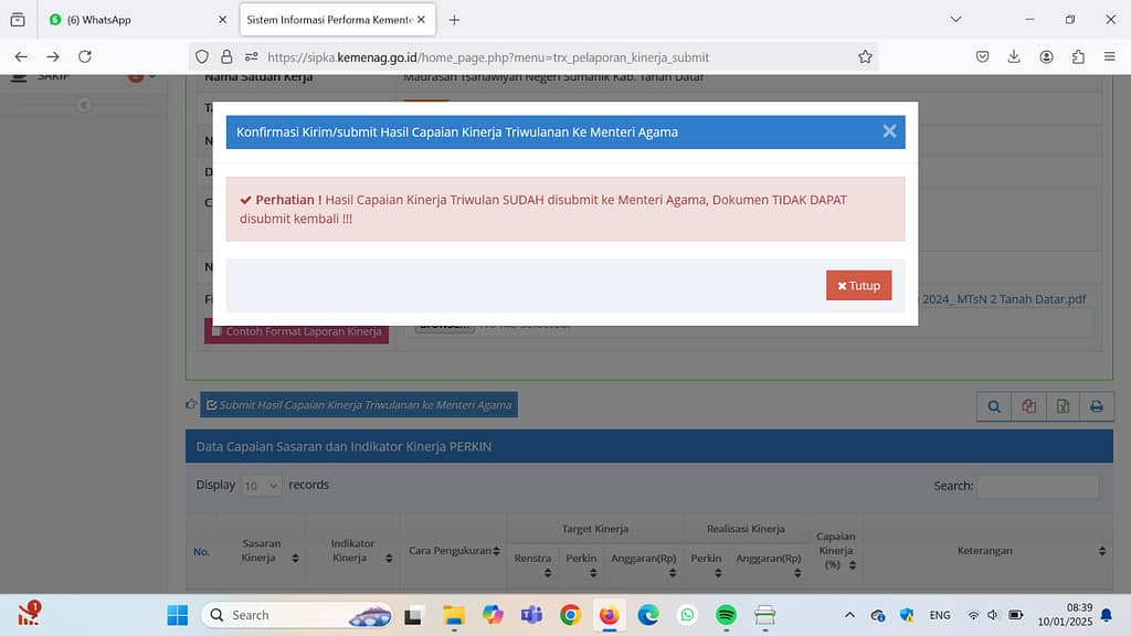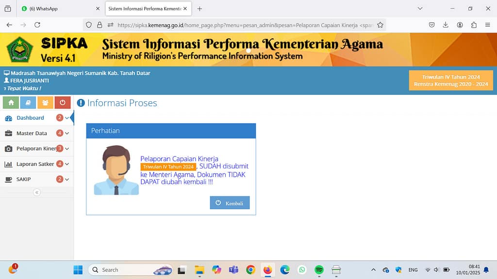Tanah Datar, 10 Januari 2025 – Sebagai upaya untuk meningkatkan kualitas layanan pendidikan berbasis data, Kepala, Wakil Kepala, Kaur, dan Pegawai MTsN 2 Tanah Datar melakukan proses submit data melalui Sistem Informasi Performa Kementerian Agama (SIPKA). Kegiatan ini merupakan bagian dari evaluasi dan pelaporan kinerja yang diwajibkan bagi setiap institusi pendidikan di bawah naungan Kementerian Agama Republik Indonesia.