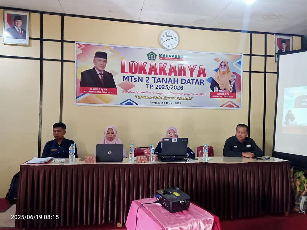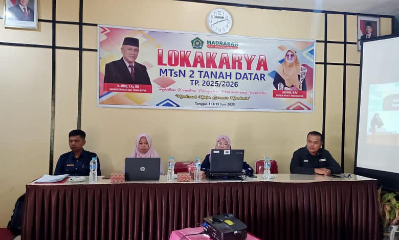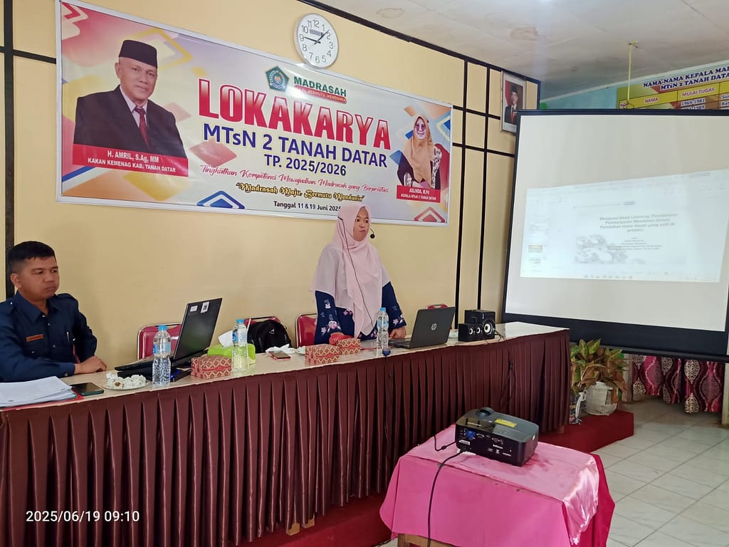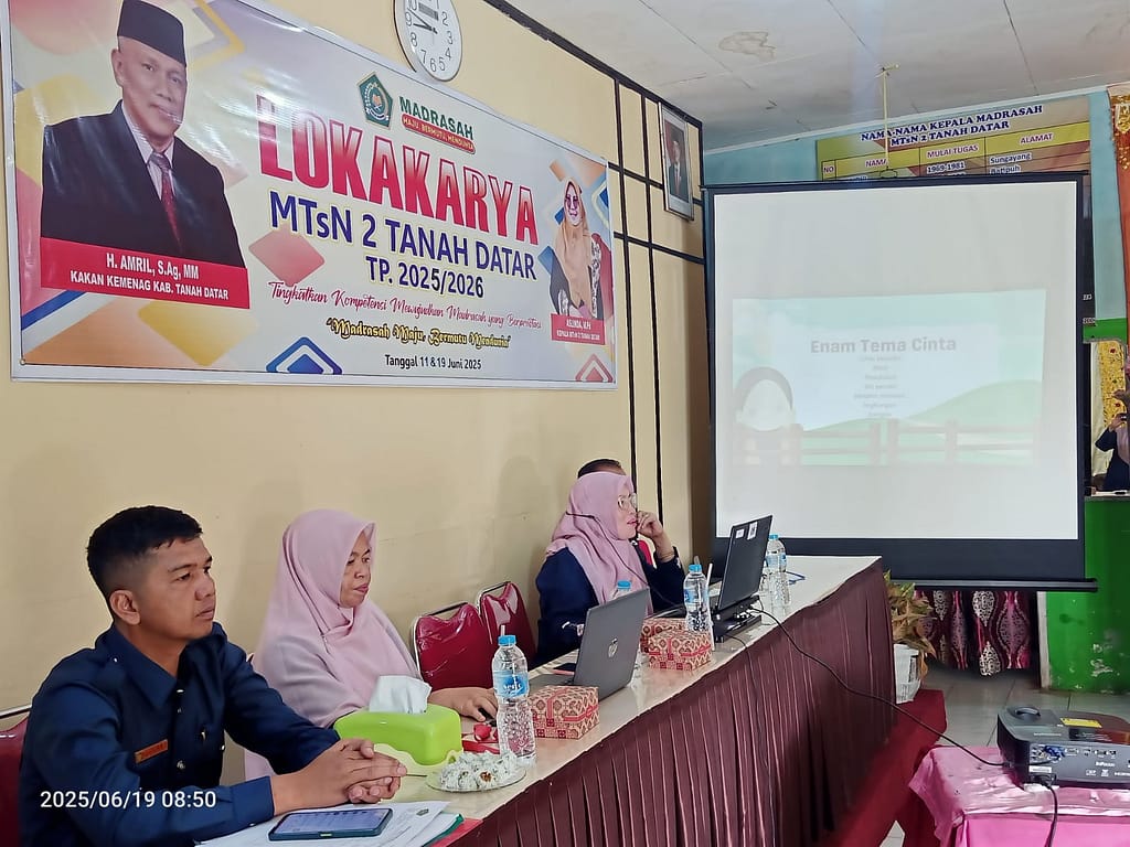 Tanah Datar, 19 Juni 2025 – Lokakarya MTsN 2 Tanah Datar memasuki hari kedua dengan semangat yang semakin menggelora. Kegiatan ini terus menjadi wadah penting bagi para pendidik dalam mengembangkan kompetensi serta memperkuat nilai-nilai moderasi dan cinta dalam pembelajaran madrasah.