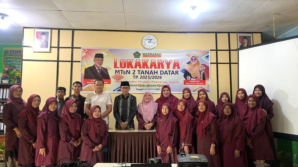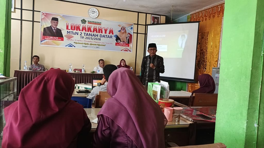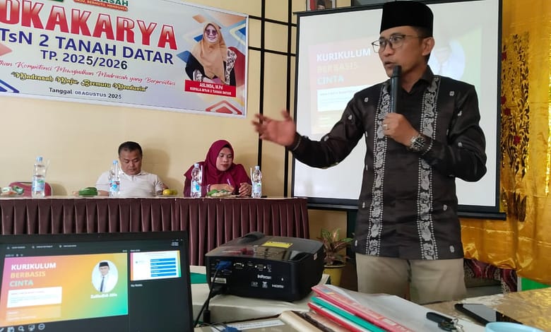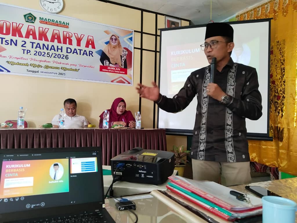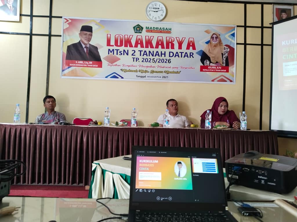 Tanah Datar, 08 Agustus 2025 – MTsN 2 Tanah Datar sukses mengadakan lokakarya pendidikan bertema “Kurikulum Cinta dan Deep Learning” pada hari Jum’at 08 Agustus 2025. Kegiatan ini dibuka secara resmi oleh Kepala MTsN 2 Tanah Datar, Ibu Aslinda, M.Pd, dan menghadirkan narasumber nasional yang juga sebagai Kepala MAN 1 Kota Bukittinggi dan Tim Kurikulum Kanwil Sumatera Barat, Bapak Zulfadhli Alfa, M.Pd.